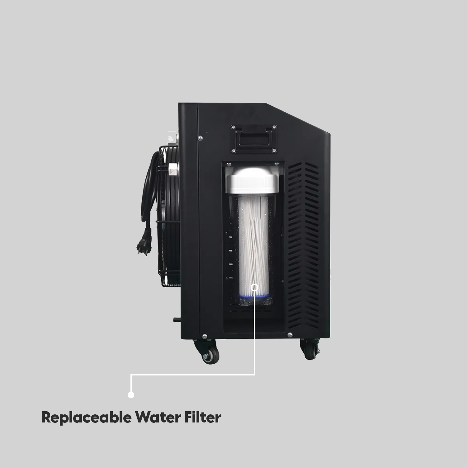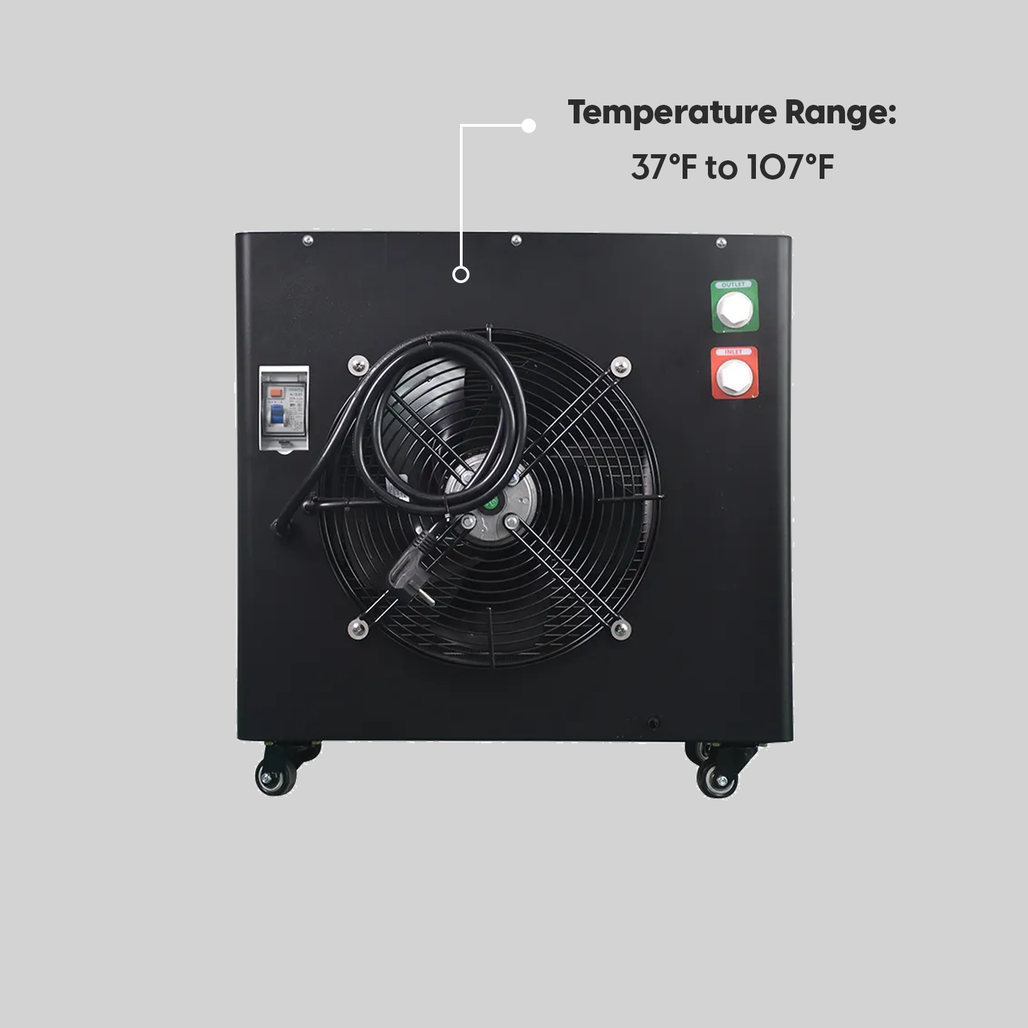 Versatile and Safe: Suitable for both indoor and covered outdoor use, the system operates on a standard 110v power outlet with built-in GFCI. The low-noise chiller unit features a leakage protection system for added security.